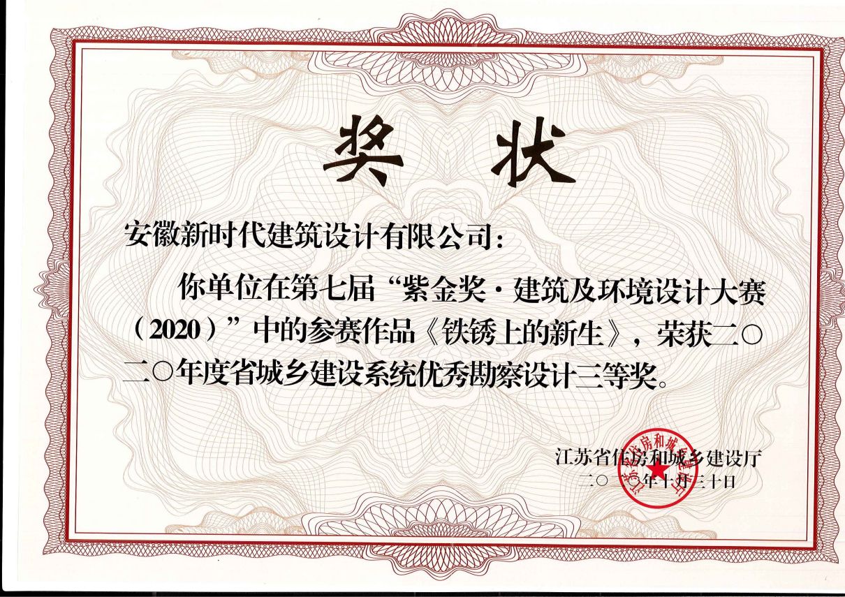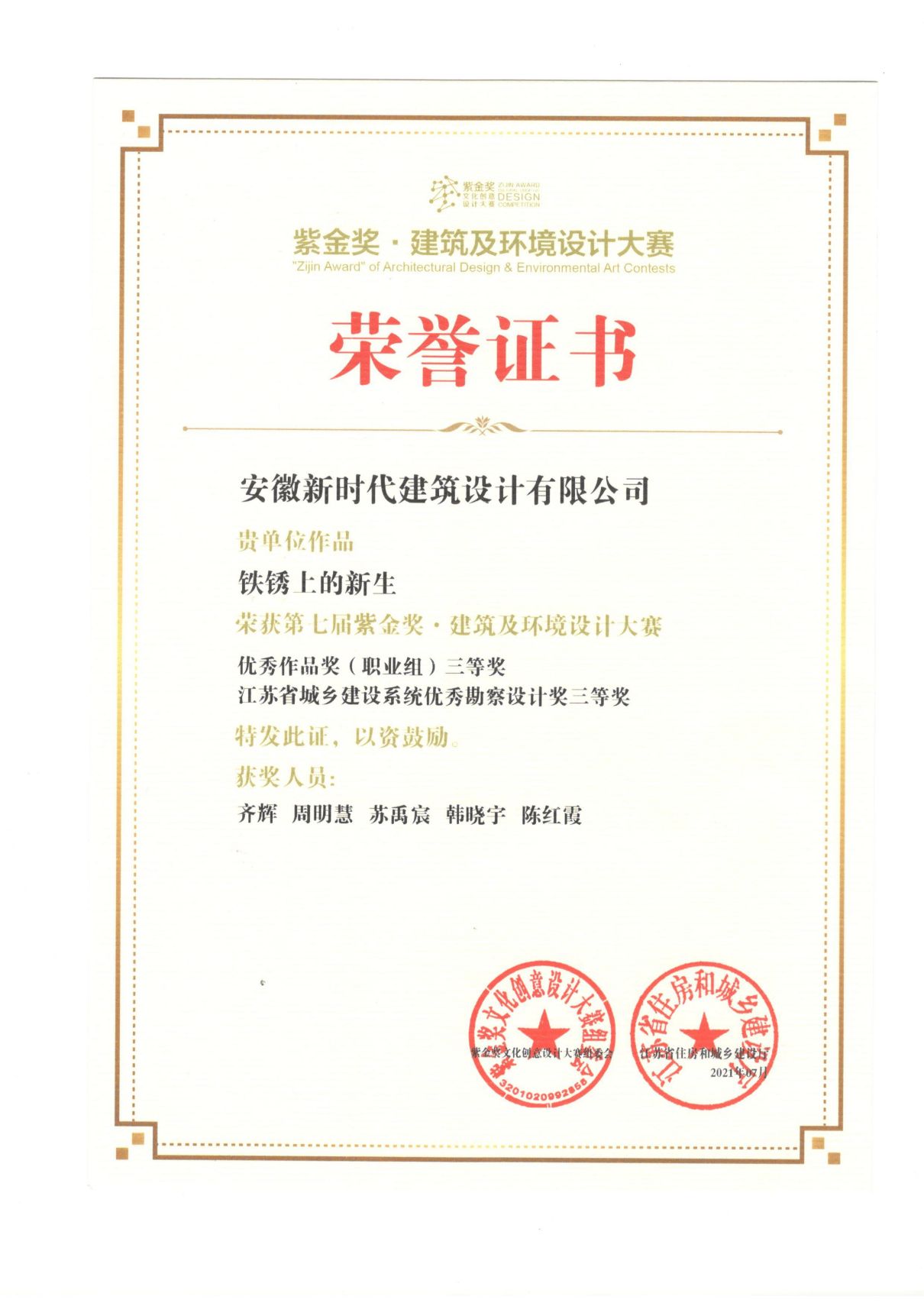 截止9月20日,第七届紫金奖· 建筑及环境设计大赛收到有效报名2279项,同比增长29.56%, 提交有效作品1678项。通过初评淘汰、三轮实名投票评选、经法律顾问全程现场见证,推荐产生“优秀作品奖”182项。其中我司团队(齐辉、周明慧、韩晓宇、陈红霞、苏禹宸)代表作品“铁锈上的新生”荣获2020年度城乡建设系统优秀勘察设计三等奖。