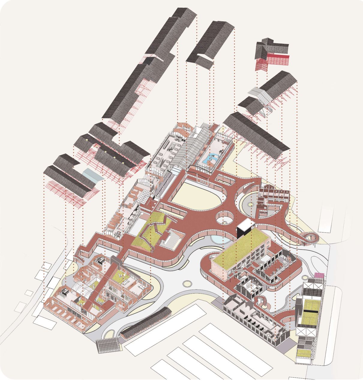 Space placement: Based on the original architectural space, the fresh supermarket, children's education, community health station, barber shop, community canteen and supporting catering, fitness, cultural activity room, exchange book bar and leisure teahouse are placed, and cultural and creative office and exhibition space are designed to attract young people.