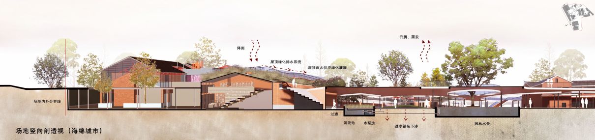 环境策略:保留场地原有大树,充分利用二层连廊和屋顶,形成立体绿化,并设计雨水收集系统,打造雨水花园。