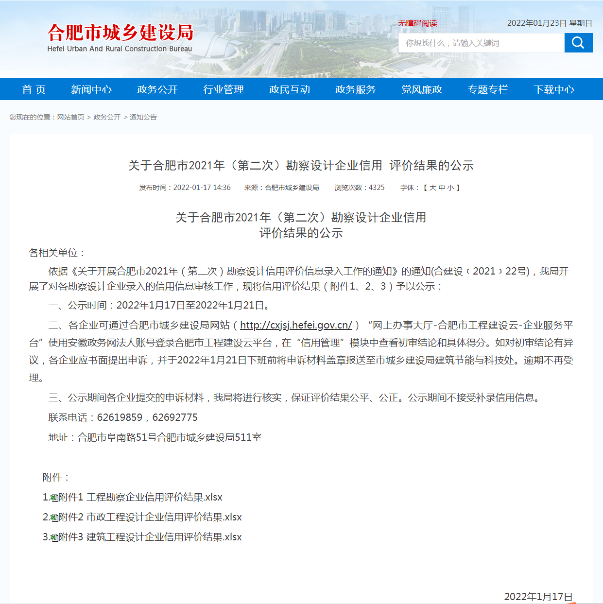 2022年1月17日,合肥市2021年第二次勘察设计企业信用评价结果公布,我公司连续两年被评为信用A级建筑工程设计企业。