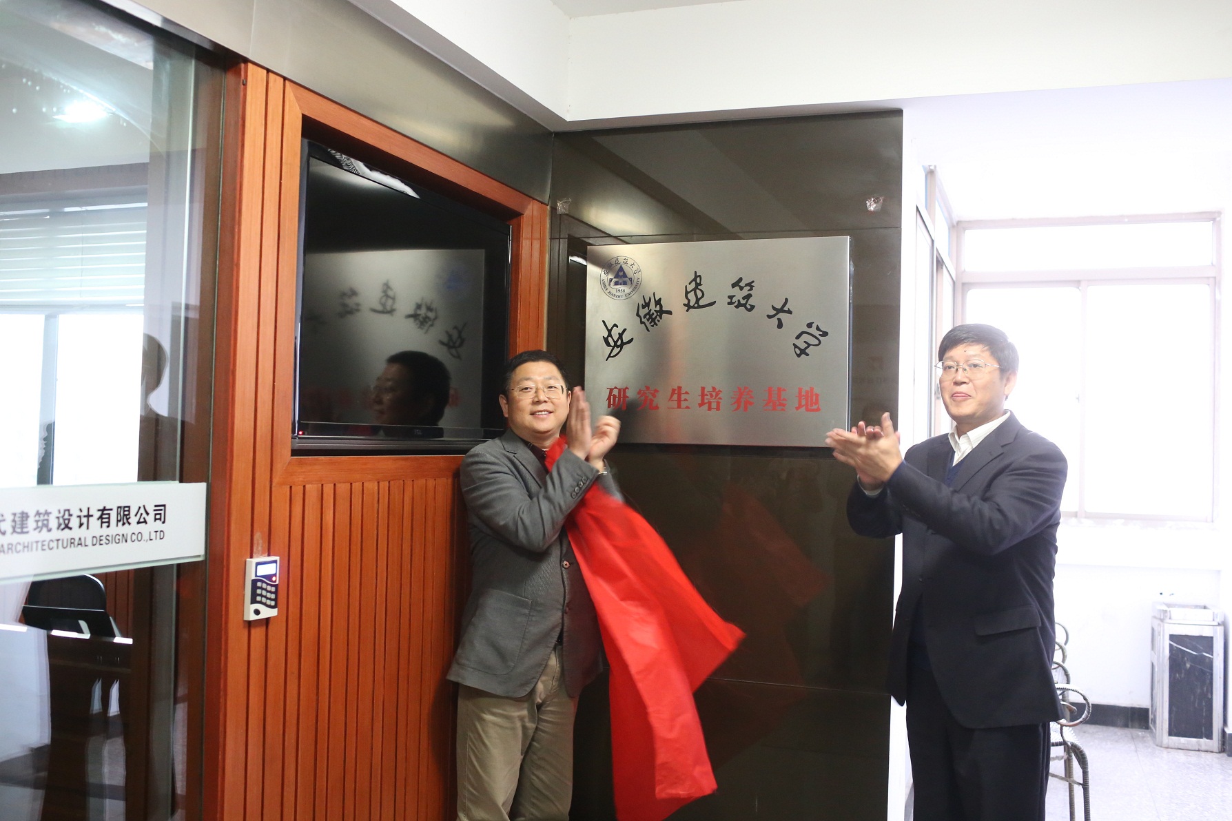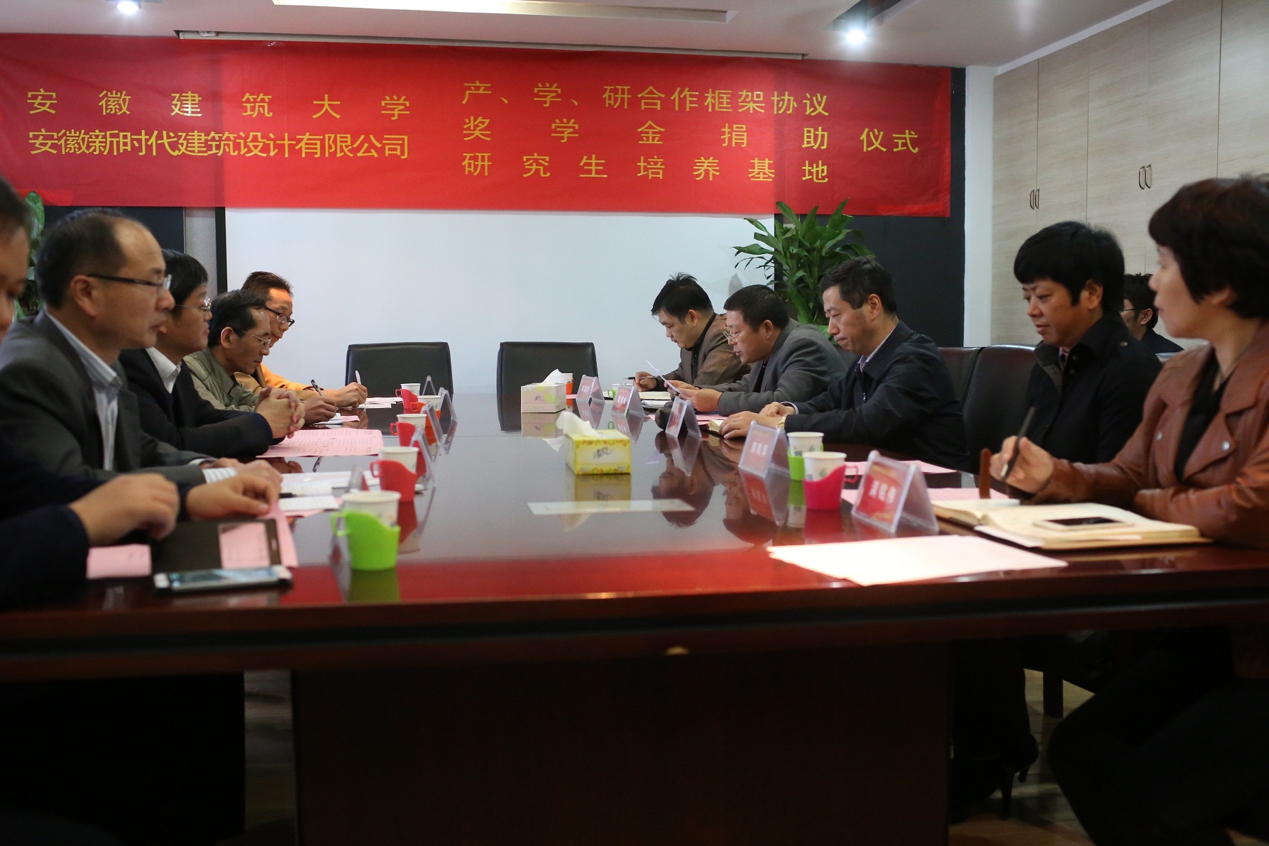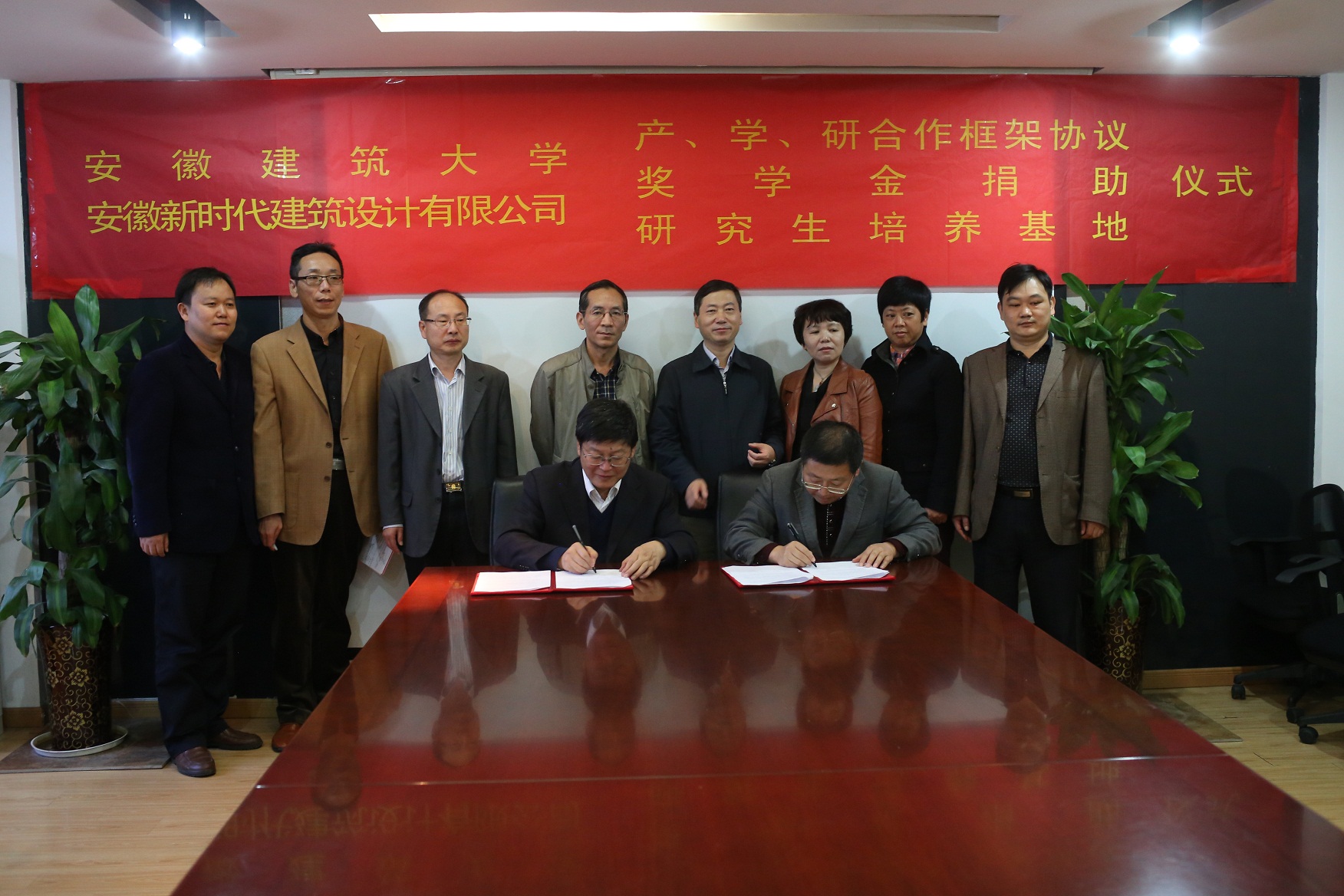 在双方参会人员的共同见证下,梁有峰与方潜生代表双方签约了产学研合作框架协议、奖学金捐助协议,并共同为安徽大学研究生培养基地揭牌。不久的将来,在“优势互补、互惠互利、协同创新、共谋发展”的原则下开展的产、学、研合作,依托我公司的资金、市场、设备等优势,利用安徽建筑大学的技术、人才、信息和实验平台等优势,根据市场的需要,双方共同开发设计新产品和技术攻关,构筑企业和高校协同创新体系,共创美好的未来。我公司向安徽建筑大学捐资50万设立新时代奖学金,用于奖励品学兼优的建大学生。会后,安徽建筑大学在公司的校友,纷纷与方校长合影留念。