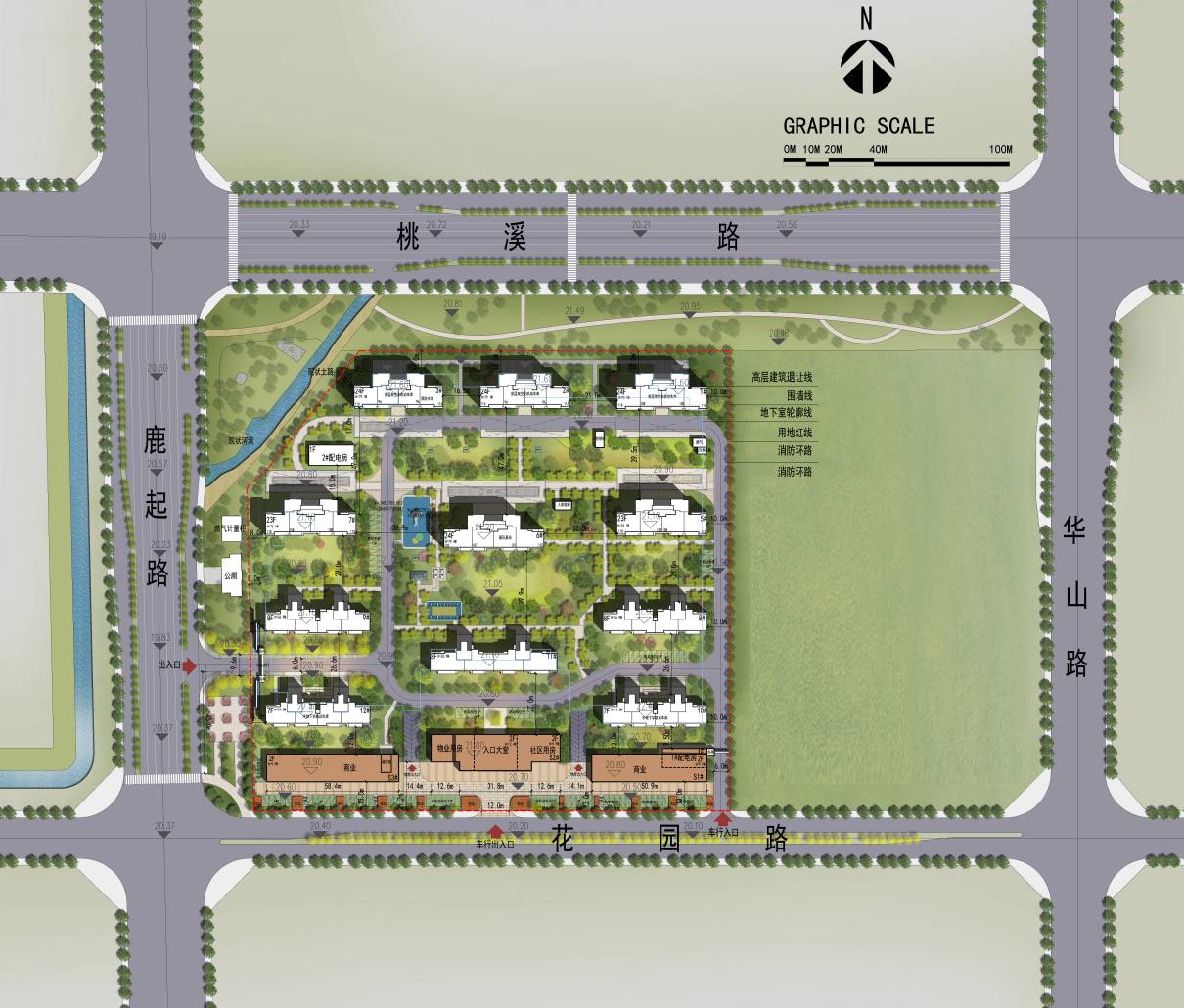 本项目西临鹿起路,西望华山路,南接花园路,北连桃溪东路;根据上位规划解读和区域规划定位,本案以“皖风徽韵,礼序空间”为主题,打造生态宜人、交通便捷、服务完善、宜居的绿色生态居住社区。