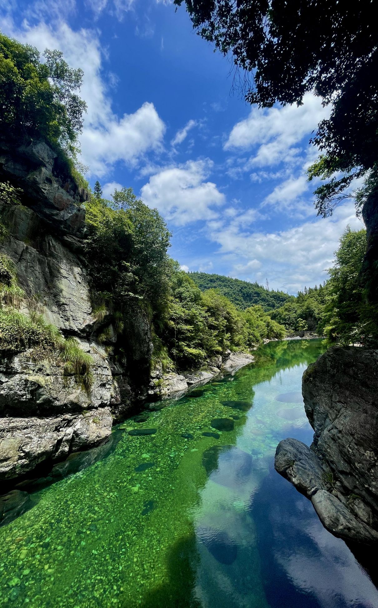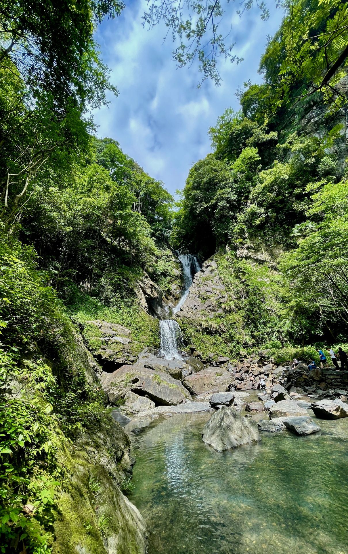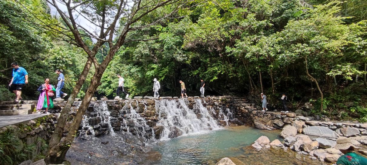 沿着山路前行,来到鸳鸯潭,潭水清澈见底,碧绿如玉。穿过栈道,便能听到“四叠飞瀑”水流声,泉水辗转四级盘石,飞流直下,声如奔雷,撼人心魂。景区奇峰遮天,青山对峙,绿树滴翠。