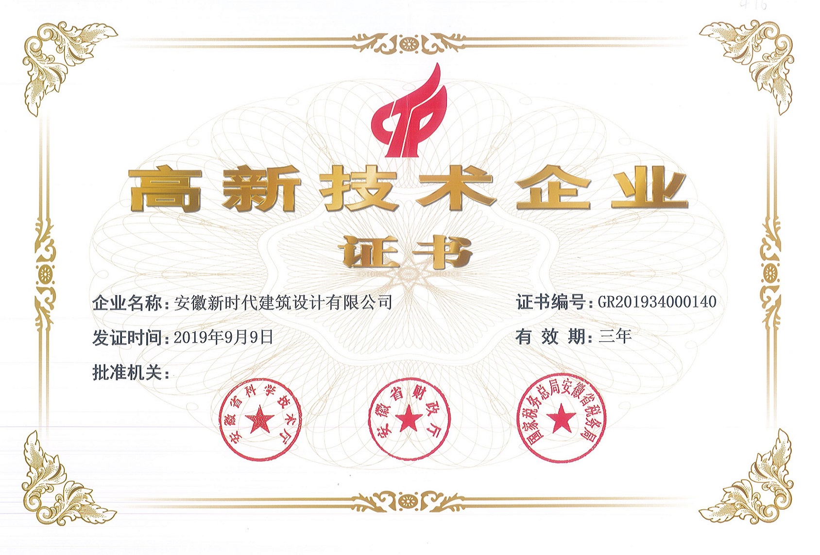 继获得合肥市高新技术企业认证后,我公司顺利通过“2019年国家级高新技术企业”认定,成为获得国家认同的建筑设计行业科技企业。